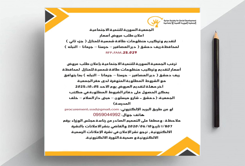 ترغب الجمعية السورية للتنمية الاجتماعية بطلب عروض أسعار
