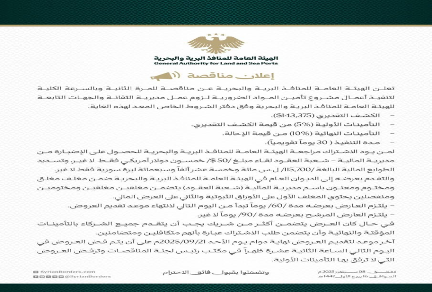 تُعلن الهيئة العامة للمنافذ البرية والبحرية عن مناقصة للمرة الثانية وبالسرعة الكلية، لتنفيذ أعمال مشروع تأمين المواد الضرورية لزوم عمل مديرية التقانة والجهات التابعة للهيئة العامة للمنافذ البرية والبحرية، وفق دفتر الشروط الخاص والمُعد لهذه الغاية.