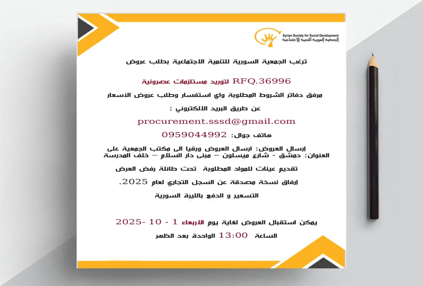 ترغب الجمعية السورية للتنمية الاجتماعية بطلب عروض أسعاربحسب الإعلان المرفق